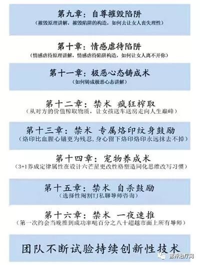 “搭讪艺术”涉诈骗、色情引发关注,PUA网络课程教“养宠”、“榨取”技能,导师指导学员让“女友”割腕 因涉及慰安妇不当言论,备受争议的网络红人、“情感教主”Ayawawa引起舆论广泛质疑。 借“情感指导”技巧吸引粉丝、进而将流量变现的Ayawawa,其名下的社交社区“花镇”,还拥有一个号称解决男性情感问题的网络社区“泡学网”,并自称“这是男性情感社区是中国泡学文化的发源地,主流PUA集中地”。 而据新京报记者调查发现,在多家知名网站上,PUA与诱奸、骗财、骗婚等词汇常常联系在一起。 何为PUA?其实它的全称为Pick-up Artist,字面意思是搭讪艺术家。曾经的PUA导师陆轩介绍,早期只是分享男性如何通过技巧和心理学应用,去接近、搭讪自己喜欢的人,但后来演化成骗色、骗财的手段,设立所谓步步陷阱的情感操控术,甚至不惜会导致对方自杀来达到情感操控目的。 目前,网络上仍有以“自杀鼓励”、“宠物养成”、“疯狂榨取”为卖点的PUA课程教学售卖,且学员众多。新京报记者近日卧底参与一个PUA授课组织,群内有300多位来自全国各地的学员,导师除了授课,还在群内指点学员如何伪装身份,进行诱骗。 北京市京师律师事务所张新年律师表示,此类欺骗行为显然违背公序良俗和法律规定,一方面,挑战社会伦理道德,另一方面,对于侵犯人身、财产权利,妨害社会管理的行为,应视情节之轻重,承担相应的法律责任。 “课程已突破道德法律底线” 在学员群,学员们将目标女性和已得手女性分别称作“猎物”、“宠物”,并一起讨论“狩猎”的经验得失。 在网页、微信公号、QQ群上搜索“PUA”,弹出来的很多都是PUA招生信息,记者统计有近50个PUA在招生,“连PUA都不知道,活该你单身”等字眼充斥在其宣传页面上。 自称“主流PUA集中地”的“泡学网”是其中之一。该网站昨日已无法打开。其官网此前显示,Ayawawa是泡学网“首席女性感情专家”。 在泡学网单月咨询套餐中,顶级导师8次一对一指导的电话咨询价格为15000元。多个导师图文和音频课程的2年系统学习权限售价为4999元,每月一次的内部YY私密课程售价是1999元,将上述课程全部打包在内的折后价格是9800元。 “官网上的价格只是针对普通会员的,要想找Ayawawa咨询,起码得十几万起步。”泡学网一名工作人员称,这会根据客户需求量身定制高级套餐。泡学网数据显示,截至5月22日,会员为182.3万人。 新京报记者随着调查的深入,找到一个名为“享妞军团”的PUA组织,在通过微信公号、YY语音等进行招生。根据上面的联系方式,记者联系上一名为“诱惑的危险”(以下简称“诱惑”)的导师。 据他透露,“享妞军团”的课程名为“五步陷阱情感操控术”,有2000元的私密课和3000元的私人定制课。 所谓的私密课,就是导师在群内进行群视频,上课根据课件内容,按章节授课。而私人定制课,则是导师评估学员个人情况后,一对一进行视频上课。 新京报记者报名后,一网名为“风吟”的助教,给记者传来了11个文档组成的课件。 课程介绍显示,一共十六章,最后几章的名称为“疯狂榨取”、“专属烙印纹身鼓励”、“宠物养成术”、“自杀鼓励”等。对此课件,“诱惑”也自称为“邪术”:“我的课程已经突破了道德和法律的底线”。 报名后,记者被助教拉入一个名为“享妞军团第五训练要塞”的QQ群。群内有300多名学员,来自全国各地,以男青年为主。群友们把被骗的女性称为“猎物”和“宠物”,交流各种经验心得。 “诱惑”和助教“风吟”经常在学员群中传播女性的图片和视频,来证明“学费很值”。 要想成为PUA先伪装成 “高富帅” 第一课形象改造,就是让学员通过各种方式,哪怕借钱吃饭,也要将自己包装成高富帅。 孔唯唯是专门反不良PUA的公益组织“小红帽”负责人。两年前,她发现有很多受害女性被“套路”诱骗,苦不堪言。因此,她成立 “小红帽”组织,揭发和预防不良PUA,以防更多女性受骗。 根据受害女性的讲述及自己的调查,自2017年6月起,孔唯唯曾三次在“小红帽”的微博上曝光过“享妞军团”直播女性自杀,偷录女性私密视频等。微博下方有数百条评论,有网友也评论“当前PUA市场太混乱,不断有女性深受其害”。 “曝光几乎没效果。”孔唯唯说,多次曝光也未切断“享妞军团”的招生牟利链条。 近日,记者所在的“享妞军团”第五训练营,共有300多名学员,如果都按照学费最低的私密课来统计,这期学员仅学费就达60万元。 4月下旬,“诱惑”在群内用视频给学员们上第一课:形象改造。让学员们通过发型、着装、朋友圈展示等手段,包装自己。 助教“风吟”给学员们传来一个压缩包,里面有900多张图片,有美食、宠物、豪车、高尔夫球、各国旅行、红酒晚宴等,让学员用这些图片发朋友圈“炫富”,把自己伪装成“高富帅” 记者发现,导师们要求学员不仅是朋友圈,现实接触中,也将姓名、职业、经历,全部虚构。学员中有几十人复姓欧阳,都是根据导师要求取的虚拟名字,“用少见的姓来让女性产生兴趣。”此外,职业也虚构成调酒师、画家、赛车手、乐队成员等,让女性产生好奇。 群内一学员孟云自称,他就以“房地产公司海外总经理”的身份,将广西一名女孩约到北京。 “防不良PUA就像防诈骗一样。”孔唯唯说,很多PUA都把自己包装为成功人士,朋友圈里展示豪车、豪宅,而这些都是虚假的,是